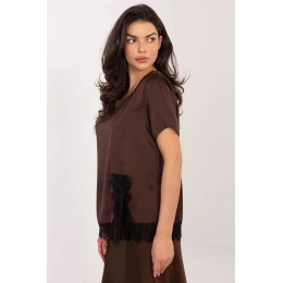 Elegantná a ženská blúzka so šik charakterom, ktorá sa skvele hodí na každodenné nosenie, do práce alebo na stretnutia. Je vyrobená z kvalitnej zmesi polyesteru a elastanu, je mäkká na dotyk, elastická a pohodlná na nosenie. Model štandardnej dĺžky má krátke rukávy a okrúhly výstrih, ktorý jemne zvýrazňuje krk. Hladký materiál jej dodáva univerzálnosť, zatiaľ čo čipkové lemovanie v spodnej časti dodáva celku jemný a elegantný nádych. Ideálna voľba pre ženy, ktoré ocenia klasický štýl s nádychom ženskej elegancie.