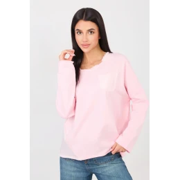 Neformálna blúzka s každodenným charakterom, ktorá spája pohodlie s jemnými ozdobnými detailmi. Je vyrobená z mäkkej bavlny s prídavkom elastanu a poskytuje pohodlie pri nosení a ľahko sa prispôsobí postave. Model s hladkým vzorom má klasický okrúhly výstrih a dlhé rukávy, ktoré sú ideálne na každodenné štylizovanie. Ozdobný nariasený materiál vo výstrihu, na vrecku a na pravej strane dodáva blúzke charakter a originalitu. Štandardná dĺžka zaručuje, že blúzka sa hodí k džínsom aj sukniam. Okrem toho praktické vrecko na úrovni hrudníka zdôrazňuje ležérny štýl a funkčnosť modelu.