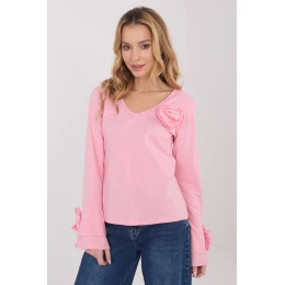 Elegantná blúzka s dlhým rukávom a priliehavým strihom, ktorá účinne zvýrazňuje postavu a kombinuje klasiku s ozdobnými detailmi. Je vyrobená z kvalitnej bavlny, poskytuje pohodlie a príjemné nosenie počas celého dňa. Model s hladkým vzorom má výstrih do V, ktorý jemne zvýrazňuje krk a dodáva mu ženský charakter. Dlhé zvonové rukávy dodávajú celku ľahkosť a eleganciu, zatiaľ čo ozdobné látkové kvety umiestnené na rukávoch a vo výstrihu sú výnimočným dekoratívnym prvkom. Štandardná dĺžka zaručuje, že blúzka je ideálna na každodenný styling, do práce, na stretnutia, ako aj na elegantné večery alebo udalosti.