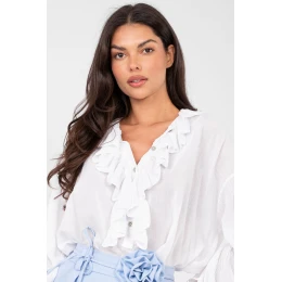 Elegantná blúzka na každý deň v boho štýle, ktorá spája pohodlie so ženským, mierne romantickým charakterom. Je vyrobená z mäkkej bavlny, vďaka čomu poskytuje pohodlie a voľnosť pohybu počas celého dňa. Model s hladkým vzorom má klasický okrúhly výstrih s jemným lemovaním, ktoré dodáva eleganciu a jemný šarm. Nafúknuté dlhé rukávy zvýrazňujú ženský strih a dodávajú celému kúsku moderný, boho vzhľad. Zapínanie na viacero gombíkov vpredu uľahčuje obliekanie a je jemným ozdobným detailom. Štandardná dĺžka zaručuje, že blúzka bude vyzerať skvele v každodennom aj kancelárskom štýle a spája pohodlie s nadčasovým štýlom.