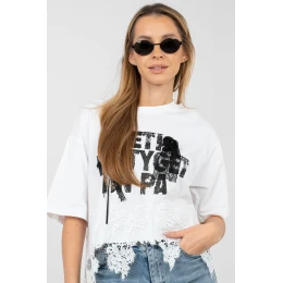 Dámska košeľa na každodenné nosenie so ženským a štýlovým charakterom. Je vyrobená z kvalitnej bavlny s prídavkom elastanu, poskytuje pohodlie, pružnosť a dobre sa prispôsobí postave. Model s krátkou dĺžkou a krátkymi rukávmi je ideálny na teplé dni. Okrúhly výstrih zdôrazňuje klasický strih a dodáva košeli univerzálny vzhľad. Ozdobný nápis na prednej strane doplnený jemnou čipkou priťahuje pozornosť a dodáva celému kúsku módny nádych. Ďalšou výhodou je čipkovaný lem košele a jemné kolieska, ktoré jej dodávajú ženský lesk. Ideálna na každodenný styling s džínsami, šortkami alebo sukňami.