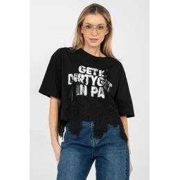 Dámsky top na každodenné nosenie so ženským a štýlovým charakterom. Je vyrobený z kvalitnej bavlny s prídavkom elastanu a poskytuje pohodlie pri nosení, pružnosť a skvelé prispôsobenie sa postave. Model s krátkou dĺžkou a krátkym rukávom je ideálny na teplejšie dni. Okrúhly výstrih zdôrazňuje klasický strih a dodáva topu univerzálny vzhľad. Ozdobný nápis na prednej strane doplnený jemnou čipkou upúta pozornosť a dodáva celému kúsku módny nádych. Ďalšou výhodou je čipkový lem topu a jemný zirkón, ktorý mu dodáva ženský lesk. Ideálny na každodenné nosenie k džínsom, šortkám alebo sukni.