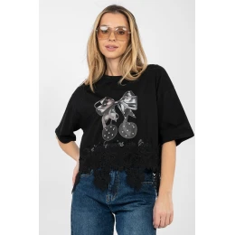 Dámska blúzka na každodenné nosenie s módnym a ženským charakterom. Je vyrobená z kvalitnej bavlny s prídavkom elastanu, čo zaručuje pohodlie pri nosení, pružnosť a dobré prispôsobenie sa siluete. Model s krátkymi rukávmi je ideálny na teplejšie dni. Okrúhly výstrih dodáva blúzke klasický a univerzálny vzhľad. Potlač na prednej strane, zdobená jemnými zirkónmi, priťahuje pozornosť a dodáva oblečeniu jemný lesk. Ďalšou výhodou je ozdobný čipkový lem v spodnej časti blúzky, ktorý zdôrazňuje ženský štýl. Ideálny dizajn na každodenné nosenie k džínsom, sukni alebo šortkám.