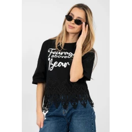 Dámsky top na každodenné nosenie so ženským a štýlovým charakterom. Je vyrobený z kvalitnej bavlny s prídavkom elastanu, poskytuje pohodlie pri nosení, pružnosť a dobre sa prispôsobuje siluete. Model s krátkou dĺžkou a krátkym rukávom je ideálny na teplejšie dni. Okrúhly výstrih zdôrazňuje klasický strih a dodáva topu univerzálny vzhľad. Ozdobný nápis na prednej strane doplnený zirkónmi priťahuje pozornosť a dodáva celému kúsku moderný nádych. Ďalšou výhodou je čipkový lem topu a jemné zirkóny, ktoré mu dodávajú ženský lesk. Ideálny na každodenné nosenie k džínsom, šortkám alebo sukni.
