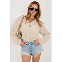 Blúzková košeľa vyrobená z kvalitnej bavlny, ktorá poskytuje pohodlie a priedušnosť počas celého dňa. Vďaka hladkému vzoru je košeľa univerzálna a ľahko kombinovateľná s mnohými štýlmi, džínsami aj sukňami. Košeľa má výstrih do V zdobený jemným gombíkom, ktorý jej dodáva jemný, ženský charakter. Štandardná dĺžka zaručuje dobré prispôsobenie sa postave a umožňuje nosiť ju rôznymi spôsobmi. Model má dlhé rukávy s možnosťou skrátenia, vďaka čomu sa košeľa ľahko prispôsobí počasiu a štýlu. Bez zapínania je pohodlná a rýchlo sa oblieka, ideálna na každodenné príležitosti.