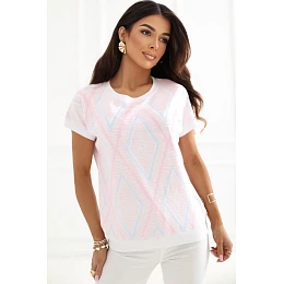 Tento dámsky top na každodenné nosenie je pohodlným a štýlovým návrhom na rôzne príležitosti. Je vyrobený z príjemnej zmesi bavlny a elastanu, poskytuje pohodlie pri nosení, dobrú priedušnosť a ľahkú elasticitu, vďaka ktorej sa prispôsobí postave. Model má geometrický vzor, ktorý mu dodáva moderný a osobitý charakter. Vďaka štandardnej dĺžke sa top skvele kombinuje s nohavicami aj sukňami. Krátke rukávy a okrúhly výstrih jemne zvýrazňujú ženskú siluetu a dodávajú celému outfitu ľahkosť. Konštrukcia bez gombíkov zvyšuje pohodlie pri nosení a uľahčuje obliekanie modelu. Univerzálny top ideálny na každý deň, skvelý do práce aj na menej formálne udalosti.