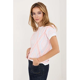 Tento dámsky top na každodenné nosenie má pohodlný a štýlový dizajn na rôzne príležitosti. Je vyrobený z príjemnej zmesi bavlny a elastanu, poskytuje pohodlie pri nosení, dobrú priedušnosť a ľahkú elasticitu, vďaka ktorej sa prispôsobí postave. Model zdobí geometrický vzor, ktorý mu dodáva moderný a výrazný charakter. Vďaka štandardnej dĺžke je top skvelým doplnkom ku nohaviciam aj sukniam. Krátke rukávy a okrúhly výstrih jemne zvýrazňujú ženskú siluetu a dodávajú celému outfitu ľahkosť. Konštrukcia bez gombíkov zvyšuje pohodlie pri nosení a uľahčuje obliekanie modelu. Univerzálny top ideálny na každý deň, skvelý do práce aj na menej formálne udalosti.
