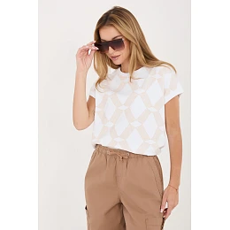 Tento dámsky top na každodenné nosenie je pohodlnou a štýlovou voľbou na rôzne príležitosti. Je vyrobený z príjemnej zmesi bavlny a elastanu, poskytuje pohodlie, dobrú priedušnosť a ľahkú elasticitu, vďaka ktorej sa prispôsobí postave. Model má geometrický vzor, ktorý mu dodáva moderný a výrazný charakter. Vďaka štandardnej dĺžke je top skvelým doplnkom ku nohaviciam aj sukniam. Krátke rukávy a okrúhly výstrih jemne zvýrazňujú ženskú siluetu a dodávajú celému outfitu ľahkosť. Konštrukcia bez gombíkov zvyšuje pohodlie pri nosení a umožňuje model ľahko obliecť. Ide o univerzálny top ideálny na každý deň, skvelý do práce aj na menej formálne udalosti.
