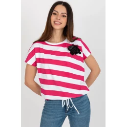 Dámska blúzka s krátkymi rukávmi a okrúhlym výstrihom vo farebných pruhoch. Ozdobná kvetinová brošňa na prednej strane.
