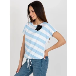 Biela a svetlomodrá pruhovaná blúzka s brošňou .
