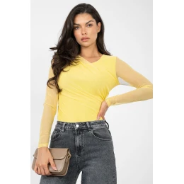 Elegantné body s klasickým priliehavým strihom, ideálne na štýlové a ženské outfity. Model je vyrobený z hladkého polyesterového materiálu s prídavkom elastanu, ktorý zaručuje pohodlie pri nosení a skvelé prispôsobenie sa postave. Okrúhly výstrih a dlhé rukávy dodávajú celku nadčasový charakter. Prednú časť body zdobia efektné záhyby, ktoré jemne zvýrazňujú postavu a dodávajú eleganciu. Model má po celej dĺžke okrem rukávov podšívku, ktorá zvyšuje pohodlie a estetiku nosenia. Zapínanie na háčik a oko v rozkroku zaručuje praktickosť a funkčnosť. Body je ideálne na elegantné aj večerné outfity.