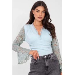 Toto elegantné body je vyrobené z kombinácie polyesteru a elastanu a spája pohodlie s rafinovaným štýlom. Model štandardnej dĺžky s výstrihom do V zvýrazňuje siluetu a dodáva celku jemne ženský charakter. Dlhé rozšírené rukávy s čipkou dodávajú ľahkosť a eleganciu, zatiaľ čo ozdobné záhyby na materiáli na prednej strane vytvárajú štýlový detail, vďaka ktorému body vynikne. Vložené vystužené košíčky a praktické zapínanie na háčiky zabezpečujú vysokú funkčnosť, vďaka čomu sa body ľahko oblieka a vyzlieka. Dominantný hladký vzor robí z tohto body univerzálny kúsok, ktorý je ideálny na špeciálne príležitosti, ako aj na elegantné každodenné outfity.