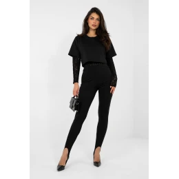 Dvojvrstvové body v ležérnom štýle je kombináciou pohodlia a ženskej estetiky. Model sa vyznačuje pestrou štruktúrou materiálu, ktorá celku dodáva moderný charakter. Body je vyrobené z kombinácie polyesteru, viskózy a elastanu, je elastické, mäkké a príjemné na nosenie. Body má štandardnú dĺžku a klasický okrúhly výstrih. Dlhé čipkované rukávy a čipkovaná spodná vrstva dodávajú ľahkosť a jemnú eleganciu, zatiaľ čo vrchná vrstva v podobe trička s krátkym rukávom vytvára efekt štýlového, vrstveného vzhľadu. Model sa zapína na háčiky a zaručuje pohodlie pri nosení a dobré nosenie. Je ideálnou voľbou na každodenný outfit k džínsom aj sukni.
