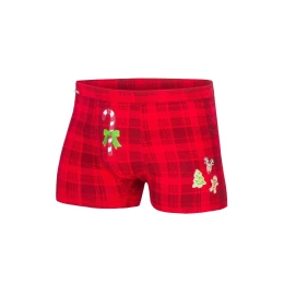 Fenomenálne červené pánske boxerky s ľahkým károvaným vzorom, zdobené vianočným lízankom uprostred a previazané elegantnou zelenou mašľou - veselá interpretácia pánskej spodnej bielizne Cornette Merry Christmas, zabalené v darčekovej krabičke pre neho.95 % bavlna, 5 % elastan.