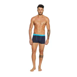 Súprava 2 pánskych boxeriek v tmavomodrej farbe, jedny sú pruhované, druhé bodkované, obe sú lemované kontrastnou niťou. Mäkký bavlnený úplet, hladký elastický pás, zloženie: 95 % bavlna, 5 % elastan.