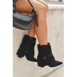 Damskie botki z eko zamszu to idealne połączenie stylu i oryginalnych detali, które przyciągają uwagę. Cholewka nachodząca na obcas subtelnie wysmukla sylwetkę, a szpiczaste noski dodają elegancji i kobiecego charakteru. Model ozdobiony frędzlami oraz cienkimi paseczkami ze złotymi klamrami wprowadza modowy akcent, nadając wyjątkowego, nowoczesnego wyglądu. Botki doskonale sprawdzą się w casualowych zestawach, jak i w bardziej wyjściowych stylizacjach, wprowadzając do nich nutę oryginalności i szyku. Komfortowe i efektowne, stanowią świetny wybór na co dzień i na specjalne okazje. Przy wyborze rozmiaru prosimy sugerować się tabelą rozmiarów.