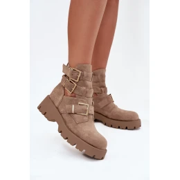 Botki Damskie Z Paskami I Złotymi Klamrami Beżowe Helisse