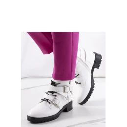 Biele topánky Donsa Model Donsa sú ideálnou voľbou pre vytvorenie módnych stylizácií. Vyrobené z vysoko kvalitnej ekologickej kože poskytujú pohodlie pri nosení. Dekoratívne spony dodávajú topánkam štýlový charakter a ľahké vystuženie koženým obložením zaisťuje, že budú ideálne na chladnejšie jesenné dni. Veľkosť je štandardná, stačí si vybrať svoju veľkosť. Topánky majú zips a podrážka je vyrobená z odolného čierneho umelého materiálu. Ideálne na jeseň/zimu.