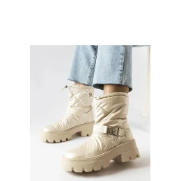 Béžové lakované snehule Ambretta sú ideálna obuv na zimu, poskytujúca nielen ochranu pred chladom a snehom, ale aj pohodlie a štýl. Ich vysoký zvršok chráni pred chladom, zatiaľ čo plochý podpätok zabezpečuje stabilitu počas chôdze. Okrúhly nos dodáva kúzlo celej konštrukcii a béžová farba lakovaného povrchu dodáva eleganciu a univerzálnosť, umožňujúcu kombináciu s rôznymi štylizáciami. Tieto teplé a izolačné topánky nie sú len praktické, ale aj veľmi módne. Vďaka vysokej kvalite spracovania a originálnemu vzhľadu sú béžové lakované snehule Ambretta must-have pre každú ženu, bez ohľadu na jej štýl. Zapínanie na golier uľahčuje obúvanie, zatiaľ čo vonkajší materiál z textilu a podrážka z umelej hmoty zabezpečujú pohodlie a odolnosť. Jedná sa o obuv, ktorá sa skvele hodí ako do športových, tak do ležérnych štýlizácií. Ideálne na jeseň a zimu.