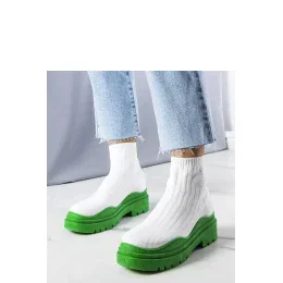 Biele ponožkové topánky so zeleným podpätkom Cali sú ponukou pre tých, ktorí si cenia pohodlie a štýl. Topánky sú nazúvacie, vyrobené z elastickej látky, ktorá sa prispôsobí tvaru nohy. Štíhla topánka siaha do polovice lýtkovej kosti a je zdobená pásikom v rovnakom farebnom prevedení ako podrážka, čo topánkam dodáva originalitu. Silná, farebná podrážka s ochranným prvkom zaisťuje istý krok a pohodlie pri nosení. Topánky majú okrúhlu špičku a číslovanie je štandardné, preto je vhodné vybrať si svoju veľkosť. Ideálne na chladné dni, pretože majú zateplenie. Topánky na robustnej podrážke sú hitom posledných sezón, ktorý určite dodá každému outfitu charakter.