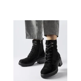 Čierne šnurovacie čižmy Clementina sú ideálnou obuvou pre chladnejšie dni. Zateplený vnútro poskytuje teplo a pohodlie a vďaka pohodlnému viazaniu si topánky ľahko prispôsobíte svojim potrebám. Čižmy majú okrúhlu špičku, ktorá im dodáva jemný pôvab a vďaka ktorej sa hodia k mnohým outfitom. Ich výška po členky zvýrazní štíhle nohy a dodá im ženský pôvab. Vďaka zipsu sa topánky ľahko obúvajú aj vyzúvajú. Vonkajší materiál je z ekologickej kože a podrážka je vyrobená z gumy. Čierne topánky na klinovom podpätku Clementina sú nielen štýlové, ale aj praktické a pohodlné, ideálne pre zimné dni. Vďaka odolnosti voči poveternostným vplyvom, zateplenej podšívke a stabilnému podpätku sú nepostrádateľné pre každodenné nosenie.