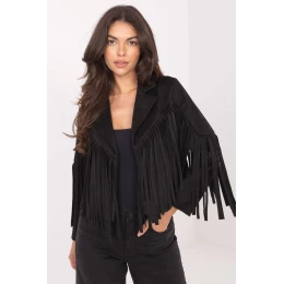 Dámska prechodná bunda s ležérnym charakterom, ideálna na jeseň, zimu a jar. Je vyrobená z polyesteru a elastanu, očarí hladkou štruktúrou materiálu a pohodlným strihom, ktorý sa dokonale hodí ku každodenným outfitom. Model štandardnej dĺžky má klasický golier a klopy, ktoré celku dodávajú nadčasový štýl. Najväčšou ozdobou bundy sú rafie umiestnené na rukávoch, vpredu a vzadu, ktoré dodávajú originálny, mierne boho charakter a zvýrazňujú outfit. Je ľahká, bez podšívky a bez zapínania, je skvelým doplnkom ku každodenným outfitom, poskytuje pohodlie a voľnosť pohybu, pričom upúta pozornosť svojím nevšedným spracovaním.