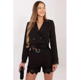 Elegantní dámský sako je jedinečný model vytvořený s ohledem na společenské události, kombinující klasický střih s efektními, ženskými zdobeními. Jeho krátká délka a propracované detaily dodávají outfitu elegantní a moderní charakter. Vyrobené z kombinace polyesteru a viskózy, sako vypadá elegantně, je příjemné na dotek a skvěle padne na postavě. Vnitřek je vybaven podšívkou, co zvyšuje pohodlí nošení a kvalitu zpracování. Dalším konstrukčním prvkem jsou vestavěné ramenní polštářky, které jemně tvarují linii ramen a dodávají saků elegantnější a společenský charakter. Dominantním dekoračním prvkem je aplikace s jetovými kamínky, která efektně září a přitahuje pohledy. Přední část sak se vyznačuje dvouradým zapínáním na knoflíky, které dává celku klasický a elegantní výraz. Spodní část sak je zdobena decentní krajkou, která se také objevuje na dlouhých rukávech, vytvářejíc harmonický a ženský doplněk celku
