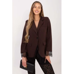 Elegantné dámske sako v nadčasovom, klasickom štýle, ideálne na formálne udalosti, do práce aj na večierok. Hladký strih podčiarkuje jeho univerzálny charakter a jemné detaily dodávajú celku výnimočnú eleganciu. Model je vyrobený z kvalitného polyesteru s prídavkom elastanu, ktorý zaručuje odolnosť, pružnosť a pohodlie pri nosení. Štandardná dĺžka a dlhé rukávy zdobené jemnou čipkou sa nádherne kombinujú s čipkovým lemom v spodnej časti saka, čo mu dodáva ženský a štýlový vzhľad. Sako má zapínanie na jeden gombík a podšívku, ktorá zvyšuje pohodlie pri nosení a robí celkový vzhľad dokonalým. Je skvelou voľbou pre ženy, ktoré chcú spojiť klasickú eleganciu s jemnou dávkou romantiky.
