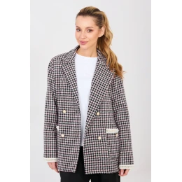 Tvídové sako v elegantnom klasickom strihu, vyrobené z kvalitnej bavlny, ideálne na jeseň, zimu a jar. Model štandardnej dĺžky s dlhými rukávmi a dvojradovým zapínaním na gombíky. Klopy, manžety a vsadené vrecká sú zdobené jemnými perličkami, ktoré saku dodávajú eleganciu a ženský charakter. Sako je podšité, má jednoduchý károvaný vzor a nie je vystužené, takže je vhodné na každodenné nosenie, spoločenské príležitosti, do práce a na elegantné udalosti.