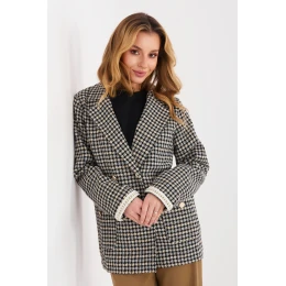 Tvídové sako s elegantným klasickým strihom, vyrobené z kvalitnej bavlny, ideálne na jeseň, zimu a jar. Model štandardnej dĺžky s dlhými rukávmi a dvojradovým zapínaním na gombíky. Klopový golier, manžety a vsadené vrecká sú zdobené jemnými perličkami, ktoré saku dodávajú eleganciu a ženský charakter. Sako je podšité, má hladký krížový vzor a je bez podšívky, takže je vhodné na každodenné aj formálne oblečenie, do práce aj na elegantné udalosti.