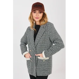 Tvídové sako v elegantnom a klasickom strihu, vyrobené z kvalitnej bavlny, ideálne na jeseň, zimu a jar. Štandardná dĺžka, dlhé rukávy a dvojradové zapínanie na gombíky. Vyhrnuté goliere, manžety a vsadené vrecká zdobené jemnými korálkami dodávajú saku eleganciu a ženský charakter. Sako je podšité, má jednoduchý károvaný vzor a nie je vystužené, takže je vhodné na každodenný aj formálny štýl, do práce aj na elegantné udalosti.