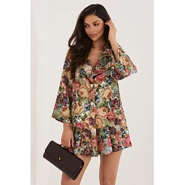 Elegantný dámsky blejzer s výnimočnou kvetinovou potlačou, ktorý dokonale spája klasiku s moderným štýlom. Je ideálny na rôzne príležitosti, vhodný do práce, na obchodné stretnutia a večierky, pričom dodáva outfitu ženský nádych. Strih krásne zvýrazňuje siluetu a jednoradové zapínanie na dva gombíky dodáva celku nadčasovú eleganciu. Široké rukávy s 3/4 dĺžkou prinášajú ľahkosť a jemný módny akcent. Model je vyrobený z kvalitnej zmesi polyesteru a elastanu, čo zaručuje pohodlie pri nosení a dobré prispôsobenie sa siluete. Blejzer má podšívku, ktorá zvyšuje komfort nosenia a vďaka ktorej dokonale prilieha na telo.