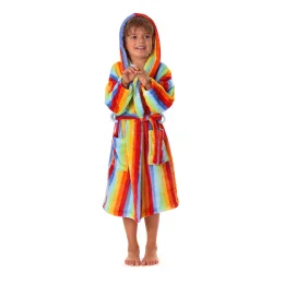 Tento veselý župan s kapucňou v žiarivých dúhových farbách je tým správnym partnerom na chladné večery a studené rána.