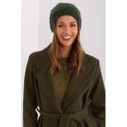 Teplá dámska zimná čiapka z hladkého úpletu s ozdobnou aplikáciou na boku.