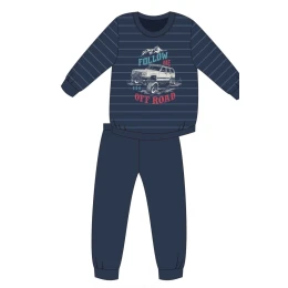 Chlapčenské pyžamo 268/124 Young Follow me Cornette - vyrobené z kvalitnej a mäkkej bavlny - tričko je tmavomodré s dlhými rukávmi - zdobené farebnou potlačou - dlhé jednofarebné nohavice majú pohodlný elastický pás Zloženie materiálu: 100% bavlna