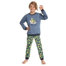 Chlapčenské pyžamo 593/91 Pepperoni Cornette - vyrobené z kvalitnej a mäkkej bavlny - modré tričko s dlhými rukávmi - zdobené farebnou potlačou - dlhé vzorované nohavice majú pohodlný elastický pás Zloženie materiálu: 100 % bavlna
