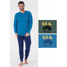 Chlapčenské pyžamo talianskej značky Karelpiu. Pyžamo sa skladá z dvoch dielov. Tričko má dlhé rukávy, ktoré sú ukončené do manžety. Spodná časť je voľná, okolo krku je okrúhly výstrih, ktorý má légu na tri gombíky. Na ľavej strane je našité vrecko na ktoré je potlač motorky. Nohavice sú v páse do pohodlnej gumy, nohavice sú ukončené do pružnej manžety. V zelenej verzii pyžamá sú nohavice šedej farby. Pyžamo je ušité z príjemnej hrejivej bavlny.