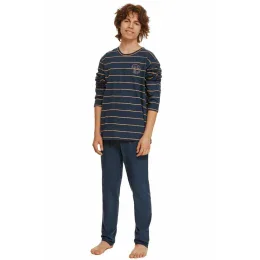 Bavlnené chlapčenské pyžamo je tmavo modré, prúžkované a má potlač malého chameleóna.