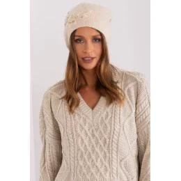 Teplá dámska zimná čiapka z hladkého úpletu s ozdobnou aplikáciou na boku.