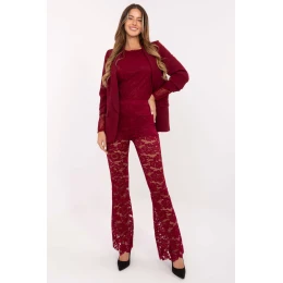Elegantné zvonové čipkované nohavice, ktoré spájajú eleganciu s výnimočným ženským charakterom. Sú vyrobené z vysokokvalitnej zmesi polyesteru, elastanu a viskózy, sú ľahké, príjemné na dotyk a zaručujú pohodlné nosenie. Model má vysoký pás so vsadenou gumičkou, čo zaručuje ideálne prispôsobenie sa postave, a široké zvonové nohavice dodávajú nohaviciam ľahký a efektný vzhľad. Celkový dojem vytvára ažurový materiál s podšívkou v hornej časti, ktorá zaručuje pohodlie a diskrétne krytie, pričom zachováva elegantný charakter nohavíc. Absencia zapínania a vreciek zdôrazňuje jednoduchosť a elegantný štýl. Skvelá voľba na spoločenské udalosti a večierky, keď chcete vyzerať efektne a žensky.