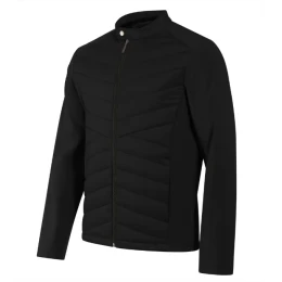 kombinácia prešívaného a softshellového materiálu rovný strih s bočnými panelmi zapínanie na gombíky stojaci golier špirálový zips po celej dĺžke bočné vrecká so špirálovým zipsom vnútorné náprsné vrecko na zips na označenie značky v zadnej podšívke