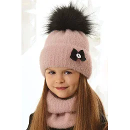 Dievčenský komplet: otočený klobúk s nadýchanou bambulou plus komín. Klobúk zdobený malou mašľou s kovovou visačkou, rolák hladký s otočeným lemom.