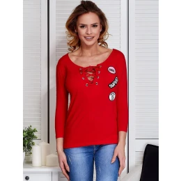 Červená šnurovacia blúzka so záplatami .