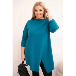 Táto dámska blúzka plus size má moderný, asymetrický strih, ktorý dodáva siluete ľahkosť a štýl. Je vyrobená z mäkkej, elastickej bavlny, čo zaručuje pohodlie pri celodennom nosení. Model má nápadný, nezvyčajný predný výstrih a ohrnuté rukávy, ktoré zdôrazňujú voľný, módny charakter blúzky. Je ideálna na každodenný styling, a to k legínam aj k jednoduchým nohaviciam.