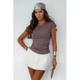 Minimalistické a zároveň ženské, toto jednoduché tričko s krátkymi rukávmi je skvelou voľbou na každý deň. Klasický okrúhly výstrih jemne zvýrazňuje dekolt a jemné záhyby na bokoch dodávajú ľahký a decentný štylizovaný akcent. Je vyrobené z mäkkého, na dotyk príjemného materiálu, dokonale sa prispôsobí postave a poskytuje pohodlie po celý deň. Ideálne je k džínsom, sukniam alebo šortkám, hodí sa k bežným aj trochu elegantnejším outfitom.