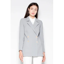 Skromné, ale veľmi elegantné dvojradové sako s dlhými rukávmi a zapínaním na gombíky. Ozdobné gombíky na rukávoch, dokonale priliehajúce na telo.