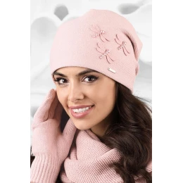 Model je vyrobený z tenšej priadze s prímesou vlny a viskózy. Prednú časť modelu zdobia pôvabné vážky. Na zadnej časti sú tri záložky. Čiapka bude ideálna na jeseň.
