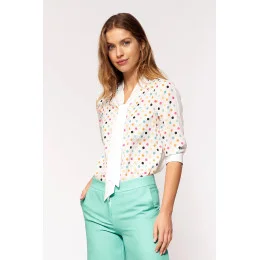 Priliehavá blúzka so zapínaním vpredu a výstrihom v tvare V, zapínanie na gombíky. Rukávy pod lakťom s manžetami na gombíky. Nepriesvitný materiál.