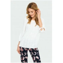 Dámska blúzka z jemného plátna, predný diel vyšívaný. Dlhé rukávy ukončené rafinovaným zaväzovaním. Široký okrúhly výstrih na dve gumičky, možnosť nosiť spustené na ramená.