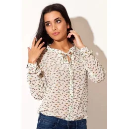 Veľmi jemná a tenká blúzka K135 KATRUS je k dispozícii v troch farbách. Blúzka s dlhými rukávmi a zaväzovaním za krkom má potlač vtákov a pierok.